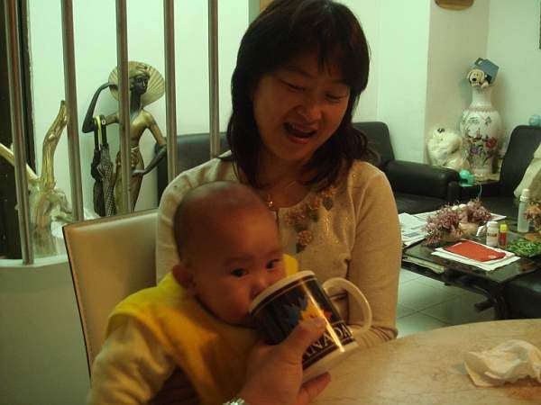 琳會抓著奶奶手中的杯子, 並且做出喝水的動作, 她只有喝奶瓶, 尚未吃過其它的東西, 怎麼會那麼厲害唷, 知道杯子是要用來喝的! (可能常常觀察大人的動作)