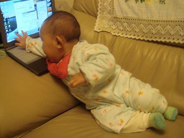 Anna 在電腦前面等等等...順便玩媽媽的新電腦 (好心疼)