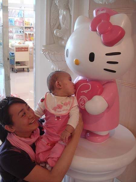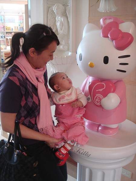 打完疫苗後, 媽媽帶琳琳去看新的 Hello Kitty 護士, 結果琳琳動作很快, 看一看竟然舔起來了!! (媽媽措手不及)