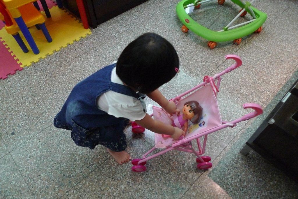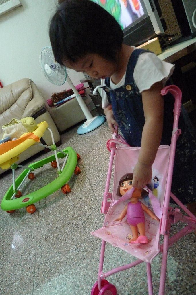 小魚很喜歡新的娃娃推車, 推來推去很可愛~