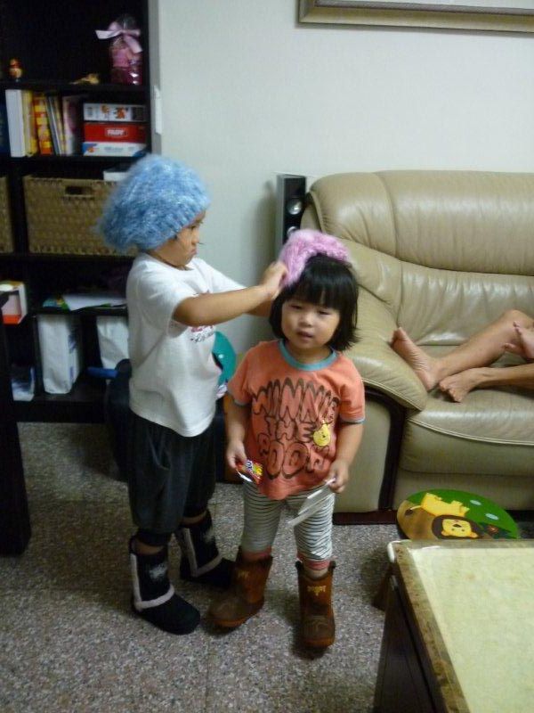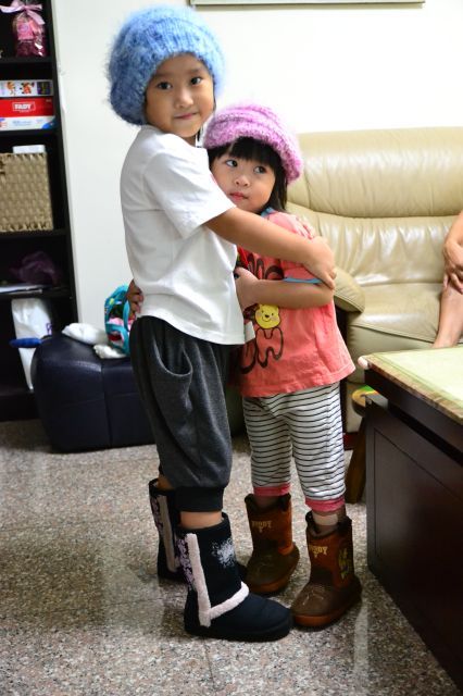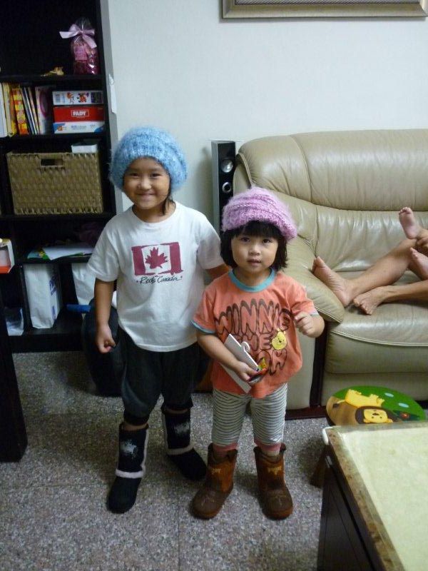 兩姐妹好高興, 馬上拿出毛線帽, 配上靴子...