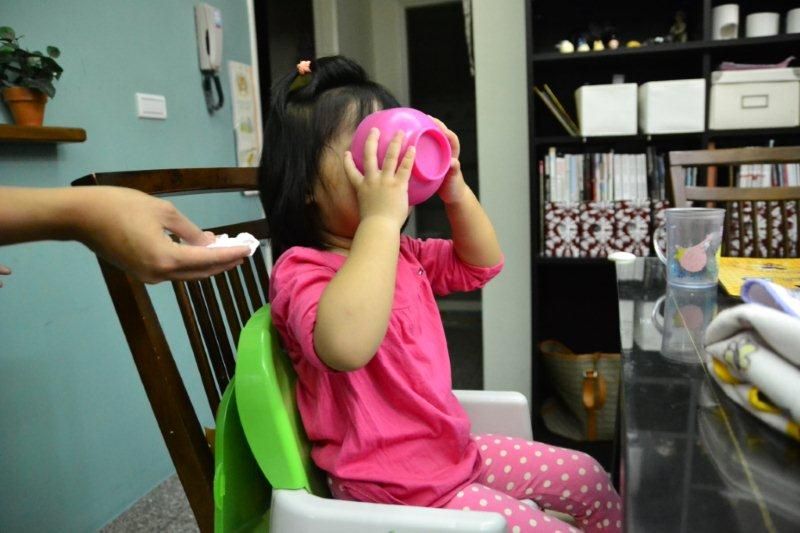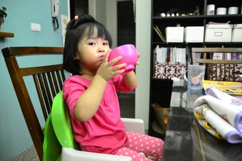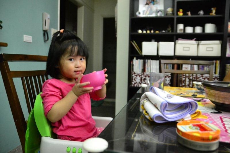 看小愉兒才兩歲就自己吃飯喝湯, 乖乖坐好